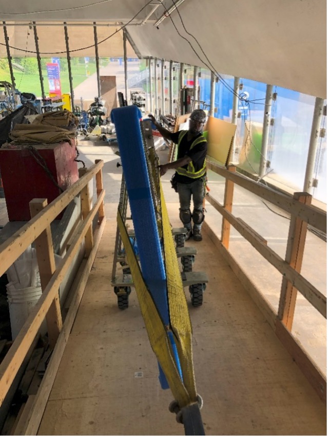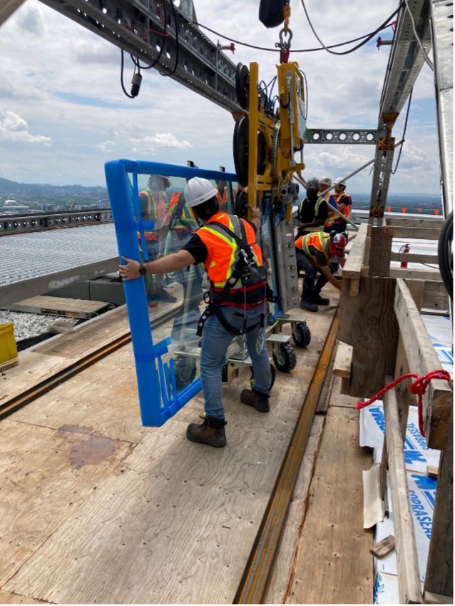 Les zones visiteurs du Tour de Montréal dans le parc olympique (Montréal au Canada) sont en cours de rénovation et de transformation. Pour la pose des éléments en verre anti-chute sur la plateforme d'observation à 165 mètres d'altitude, Heavydrive a fourni à Matériel de levage Inc., entreprise basée à Montréal, six chariots pneumatiques HDL 700 A ainsi qu’une version spéciale du chariot porte-vitre.