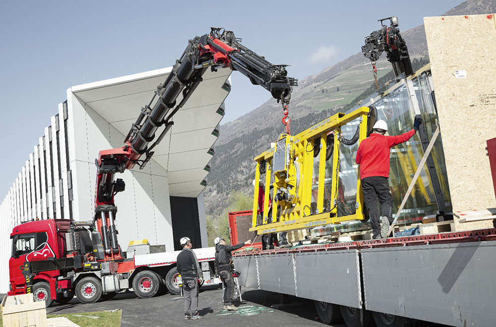À Schlanders, dans le val Venosta dans le Tyrol du Sud (Italie), BSV GmbH a ouvert début mai son nouveau bâtiment d'entreprise, conçu par le bureau d'architecture Marx-Ladurner. Le siège social du fabricant de systèmes de portes, de fenêtres, de façades et de systèmes solaires s'étend sur 120 mètres de long et se termine en pointe. Les équipements spéciaux Heavydrive ont été utilisés pour le montage des éléments de façade de 10,7 mètres de haut.