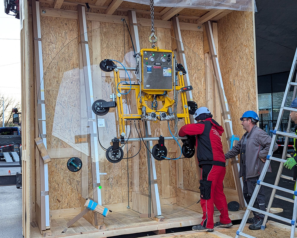 Des petites ventouses pour lourdes charges avec une capacité de charge de 1 500 kg permettent, avec leur unité rotative motorisée et pivot entièrement hydraulique, une pose murale ou au plafond d’éléments jusqu’à 6 m de longueur.